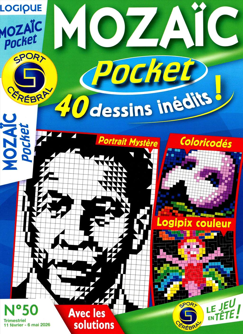 Magazine, petit format, constitué de jeux de logique pour adultes : Portraits mystère, points à relier, logipix, coloricodés, labymage, etc.