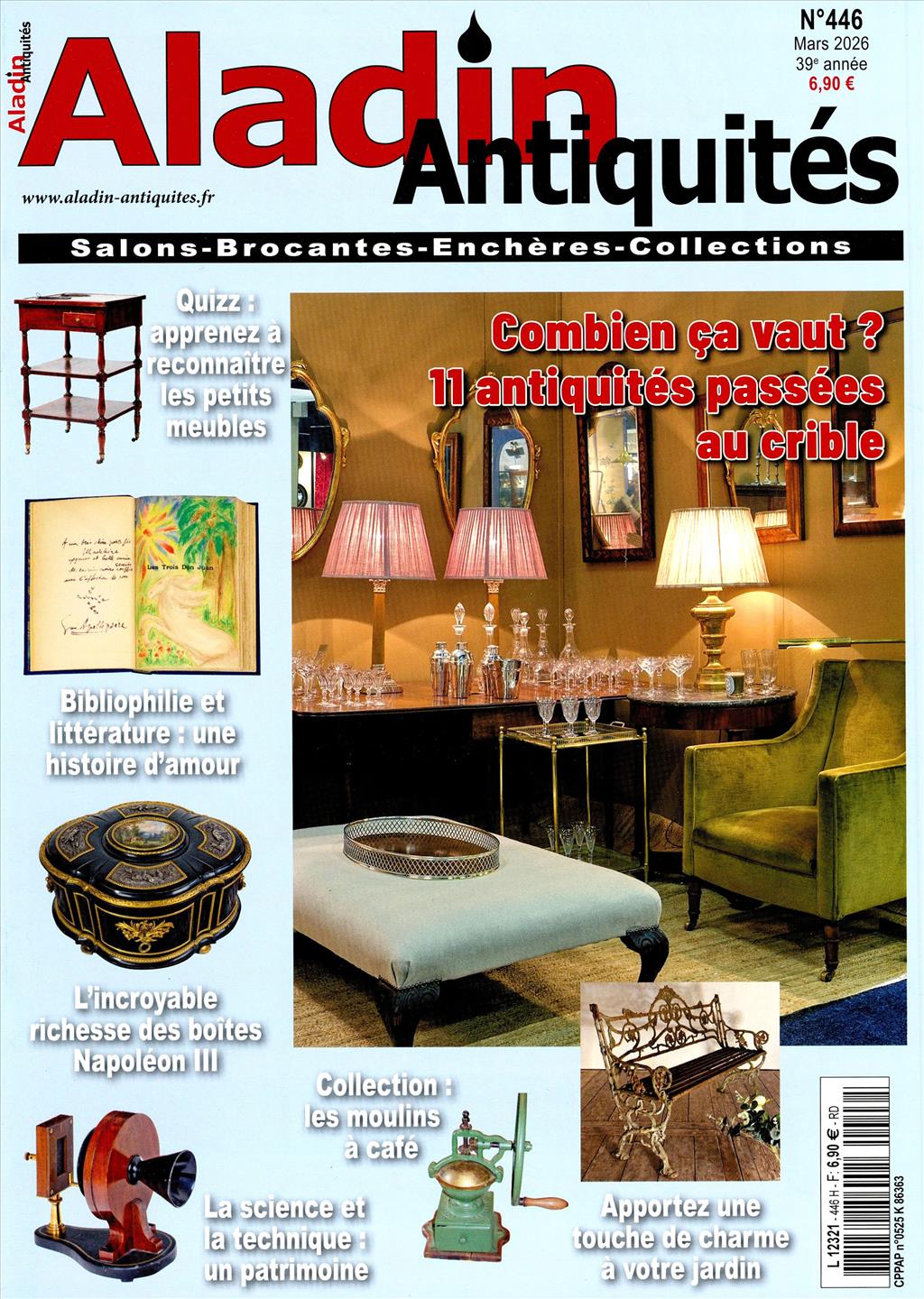 ALADIN ANTIQUITES est le magazine de référence sur le mobilier et les objets anciens. Les articles illustrés étudient les styles et les époques, mettent en scène des objets d'arts décoratifs et analysent l'actualité du marché.