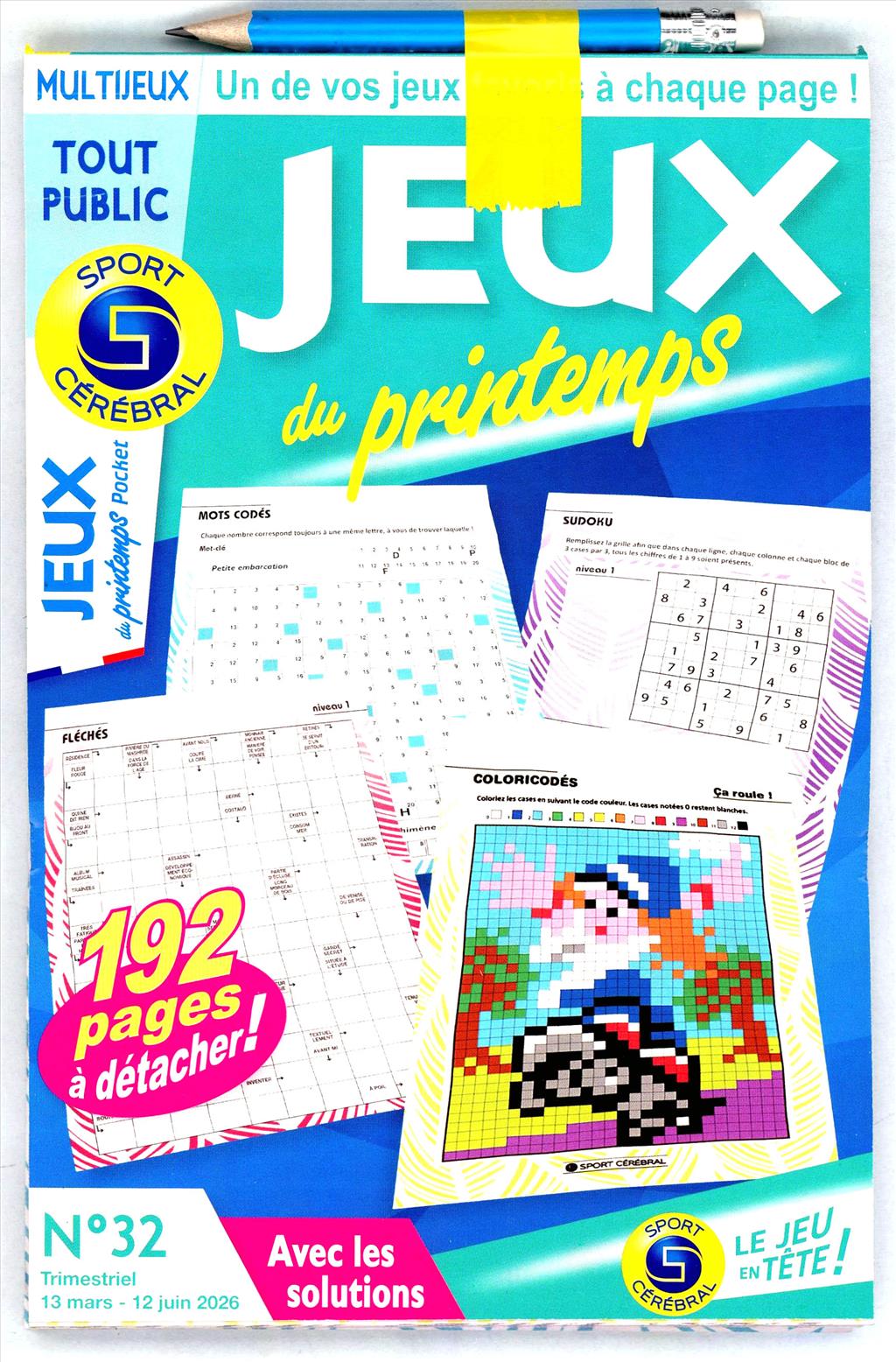 Revue qui propose une variété de jeux : mots fléchés, énigmes de sudoku, jeux de dessin dans un format bloc.
