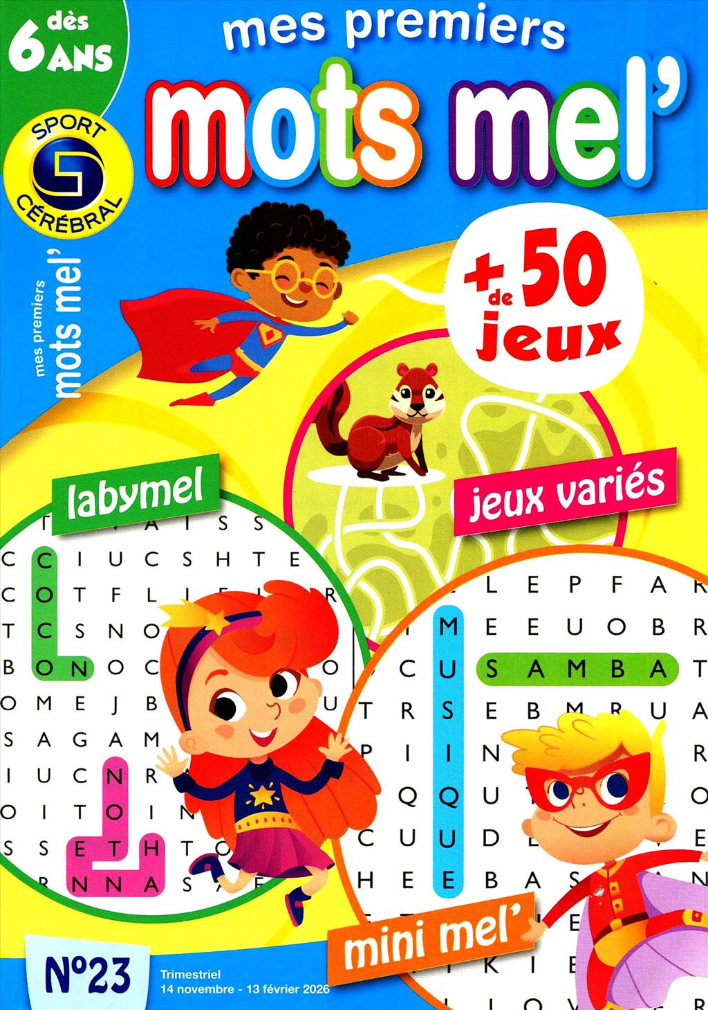 Magazine de mots mêlés pour les enfants à partir de 6 ans (petit format). Cette revue compte également d'autres jeux : Labyrinthe, points à relier, croisé-dessiné et des jeux surprises.
